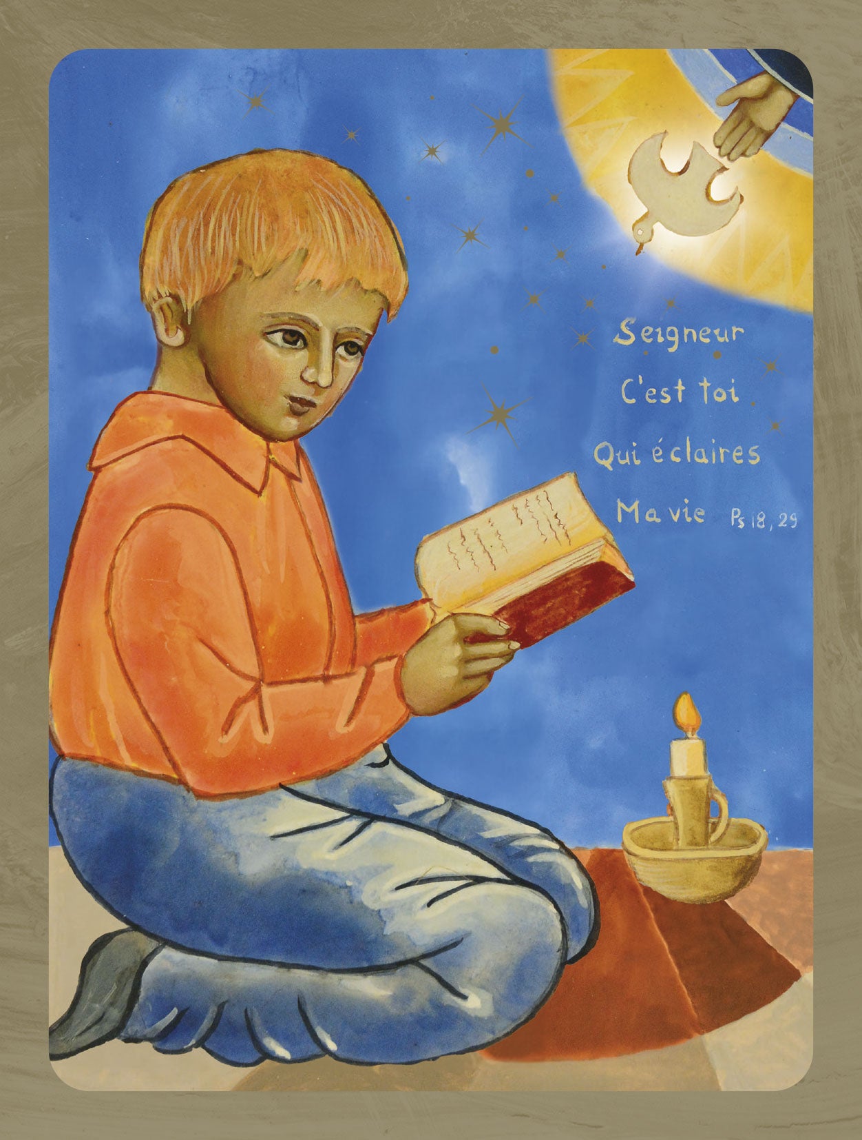 Inspirée d'un passage biblique et d'une peinture du petit Samuel par Reynolds, cette icône représente un petit garçon en prière. Dans la sérénité de la nuit représentée par le fond bleu étoilé, le petit garçon médite la Parole de Dieu dans son coin prière. Il est béni par la main du Père qui lui envoie la lumière de l'Esprit Saint. Dans des couleurs joyeuses, cette icône fera un cadeau idéal pour un petit garçon. La sagesse et l'humilité priante de ce petit garçon sont aussi une invitation concernant les chrétiens de tout âge. Une icône semblable existe pour les petites filles.
