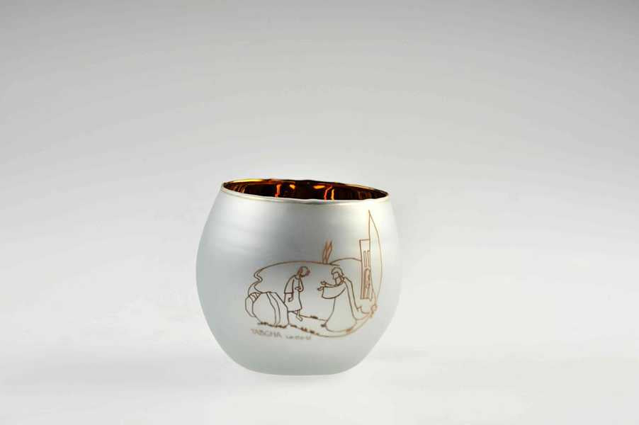 Photophore en verre métalisé et motif 'Le fils prodigue. La vente de ce produit permet d'agir en faveur de nos Frères et Soeurs du monde entier, grâce au soutien apporté à l' Aide á l'Église en Détresse, et l'Oeuvre d'Orient.