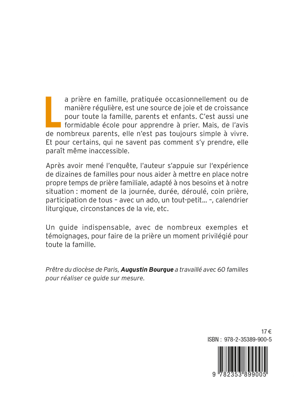La prière en famille, pratiquée occasionnellement ou de manière régulière, est une source de joie et de croissance pour toute la famille, parents et enfants. C'est aussi une formidable école pour apprendre à prier. Mais, de l'avis de nombreux parents, elle n'est pas toujours simple à vivre. Et pour certains, qui ne savent pas comment s'y prendre, elle paraît même inaccessible. Après avoir mené l'enquête, l'auteur s'appuie sur l'expérience de dizaines de familles pour nous aider à mettre en place notre propre temps de prière familiale, adapté à nos besoins et à notre situation : moment de la journée, durée, déroulé, coin prière, participation de tous ' avec un ado, un tout-petit' ', calendrier liturgique, circonstances de la vie, etc. Un guide indispensable, avec de nombreux exemples et témoignages, pour faire de la prière un moment privilégié pour toute la famille