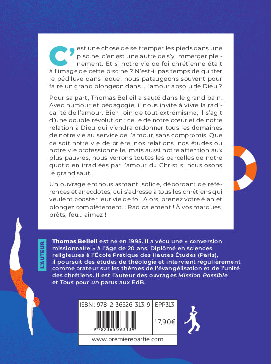 ARGUMENTAIRE C'est une chose de se tremper les pieds dans une piscine, c'en est une autre de s'y immerger pleinement. Et si notre vie de foi chrétienne était à l'image de cette piscine ' N'est-il pas temps de quitter le pédiluve dans lequel nous pataugeons souvent pour faire un grand plongeon dans... l'amour absolu de Dieu ' Thomas Belleil a sauté dans le grand bain. Avec humour et pédagogie, il nous invite à vivre la radicalité de l'amour. Bien loin de tout extrémisme, il s'agit d'une double révolution : celle de notre c'ur et de notre relation à Dieu qui viendra ordonner tous les domaines de notre vie au service de l'amour, sans compromis. Que ce soit notre vie de prière, nos relations, nos études ou notre vie professionnelle, mais aussi notre attention aux plus pauvres, nous verrons toutes les parcelles de notre quotidien irradiées par l'amour du Christ si nous osons le grand saut. Un ouvrage enthousiasmant, solide, débordant de références et anecdotes, qui s'adresse à tous les chrétiens qui veulent booster leur vie de foi. Alors, prenez votre élan et plongez complètement... Radicalement ! À vos marques, prêts, feu... aimez ! AUTEUR Thomas Belleil est né en 1995. Il a vécu une conversion missionnaire à l'âge de 20 ans. Diplômé en sciences religieuses à l'École Pratique des Hautes Études (Paris), il poursuit des études de théologie et intervient régulièrement comme orateur sur les thèmes de l'évangélisation et de l'unité des chrétiens. Il est l'auteur des ouvrages Mission Possible et Tous pour un parus aux EdB.