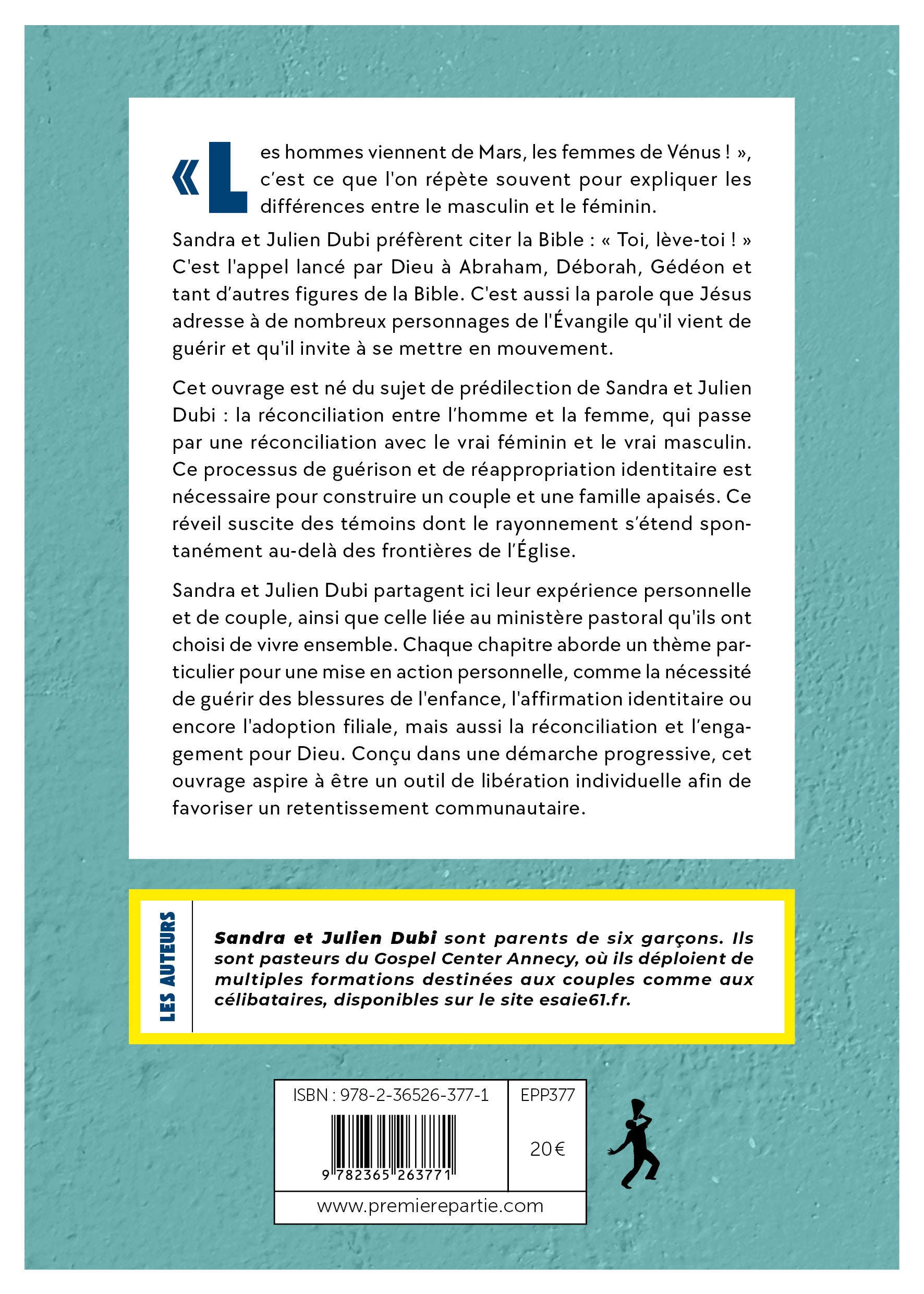 « Toi, lève-toi ! » : c'est l'appel lancé par Dieu à de nombreuses figures bibliques comme Abraham, Déborah et Gédéon. C'est aussi la parole que Jésus donne à de nombreux personnages de l'Évangile qu'il vient de guérir et qu'il invite à se mettre en mouvement.Cet ouvrage est né du sujet de prédilection de Julien et Sandra Dubi : la réconciliation entre l'homme et la femme. Cette dernière passe par une réconciliation avec le vrai féminin et le vrai masculin. Ce processus de guérison et de réappropriation identitaire est nécessaire pour construire un couple et une famille apaisés et rayonnants. Le réveil qui en découlera rejaillira non seulement sur l'Église, mais au-delà.Dans ce premier ouvrage qu'ils ont choisi d'écrire à quatre mains, Sandra et Julien Dubi partagent leur témoignage personnel et de couple, ainsi que celui relatif au ministère pastoral qu'ils vivent ensemble. Ils relient ces éléments de témoignages à des thèmes-clés de leurs formations : la nécessité de guérir les blessures de l'enfance, l'engagement pour Dieu, l'affirmation identitaire, la famille, l'adoption filiale, la réconciliation, etc.