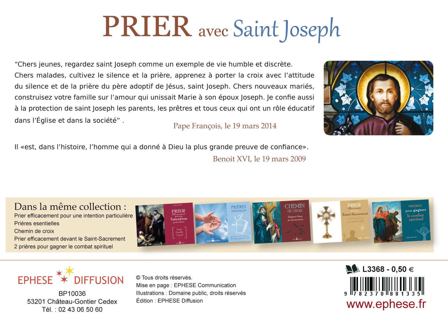 Dans sa collection des feuillets de prière, idéal pour l'évangélisation, Ephèse Diffusion vous propose ce dépliant de 8 pages pour prier avec Saint Joseph.Vous y trouverez les principales prières à Saint Joseph : Je vous salue Joseph, Souvenez-Vous, la prière du pape François pour l'année Saint Joseph, la prière miraculeuse et la prière infaillible à Saint Joseph, une neuvaine et tout savoir pour quoi prier Saint Joseph.