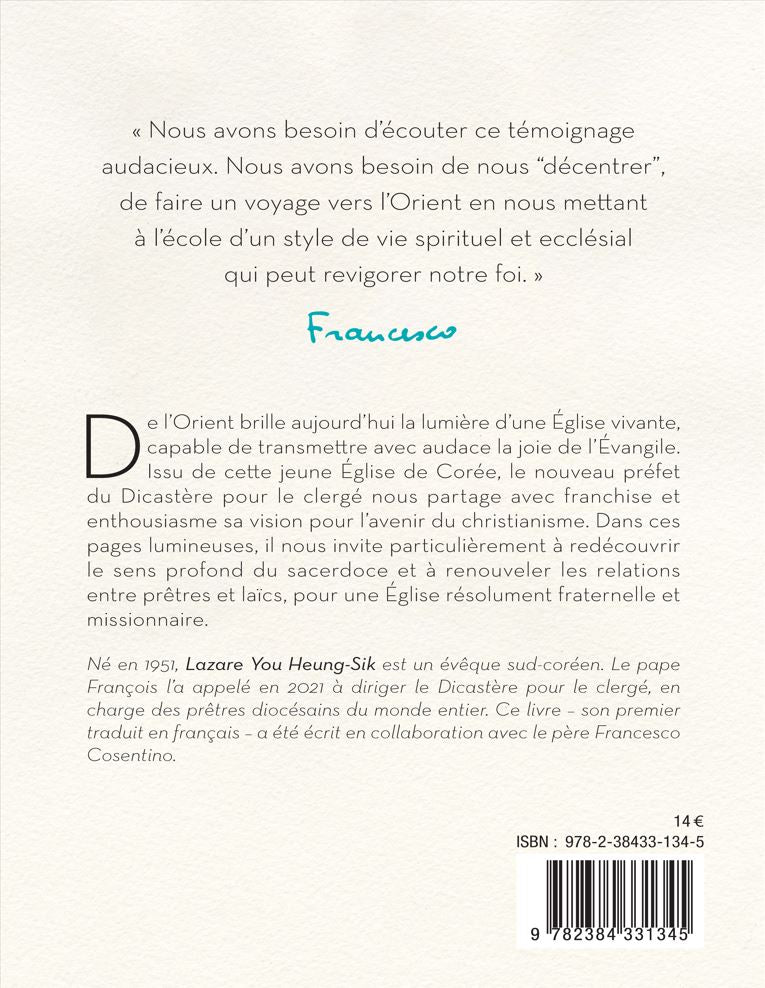Issu de la jeune et vivante église de Corée, fécondée par le sang des martyrs, le cardinal You partage avec enthousiasme et franchise sa vision pour l'avenir de l'Église. Il nous invite à redécouvrir le sens profond du sacerdoce et à renouveler les relations entre prêtres et laïcs, pour une Église plus fraternelle et missionnaire. « Nous avons besoin d'écouter ce témoignage audacieux ['], nous avons besoin de nous 'décentrer', de faire un voyage en Orient et de nous mettre à l'école d'un mode de vie ecclésial et spirituel qui peut revigorer notre foi. » (Pape François)