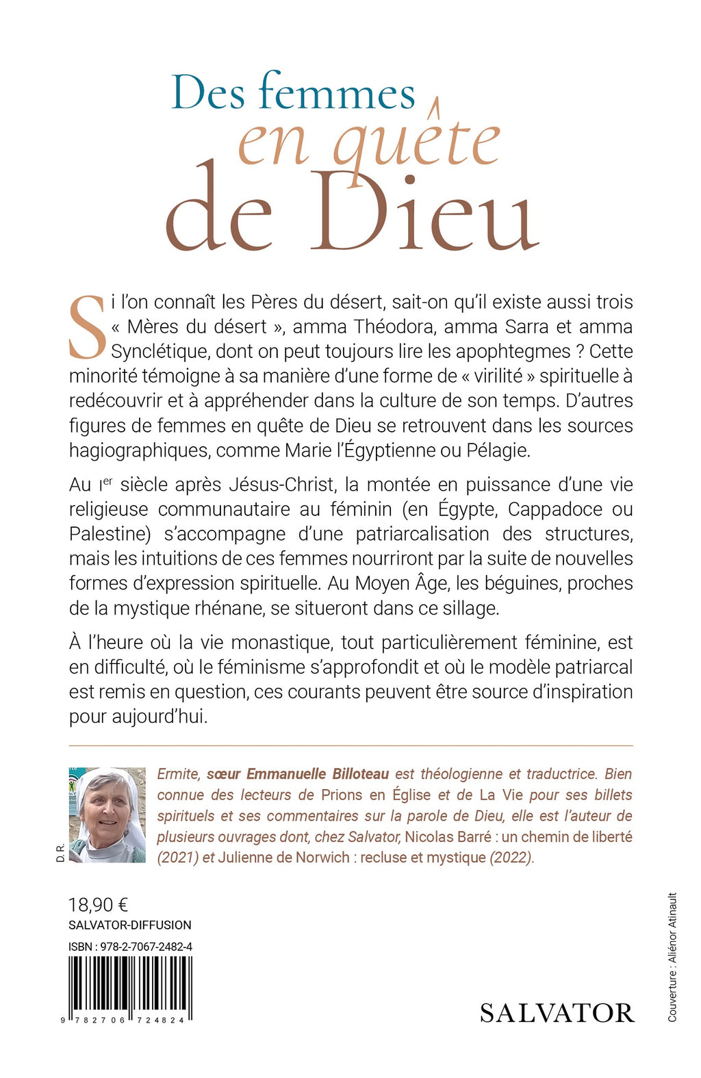 Ermite, soeur Emmanuelle Billoteau est théologienne et traductrice. Elle est l'auteure de plusieurs ouvrages dont, chez Salvator, Nicolas Barré : un chemin de liberté (2021) et Julienne de Norwich : recluse et mystique (2022).