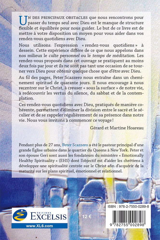 Un des principaux obstacles que nous rencontrons pour passer du temps seul avec Dieu est le manque de structure flexible et équilibrée pour nous guider. Le but de ce livre est de mettre à votre disposition un moyen pour vous aider dans vos rendez-vous quotidiens avec Dieu. Les rendez-vous proposés dans cet ouvrage se pratiquent au moins deux fois par jour et ils ne sont pas tant une occasion de se tourner vers Dieu pour obtenir quelque chose que d'être avec Dieu. Au fil des pages, Peter Scazzero nous entraîne dans un cheminement spirituel de quarante jours. Il nous encourage à nous recentrer sur le Christ, à creuser « sous la surface » de notre vie, à redécouvrir les vertus du silence, du sabbat et de la contemplation. Ces rendez-vous quotidiens avec Dieu, pratiqués de manière cohérente, permettent d'éliminer la division entre le sacré et le séculier et de se rappeler régulièrement de sa présence dans notre vie. Nous vous invitons à commencer ce voyage !