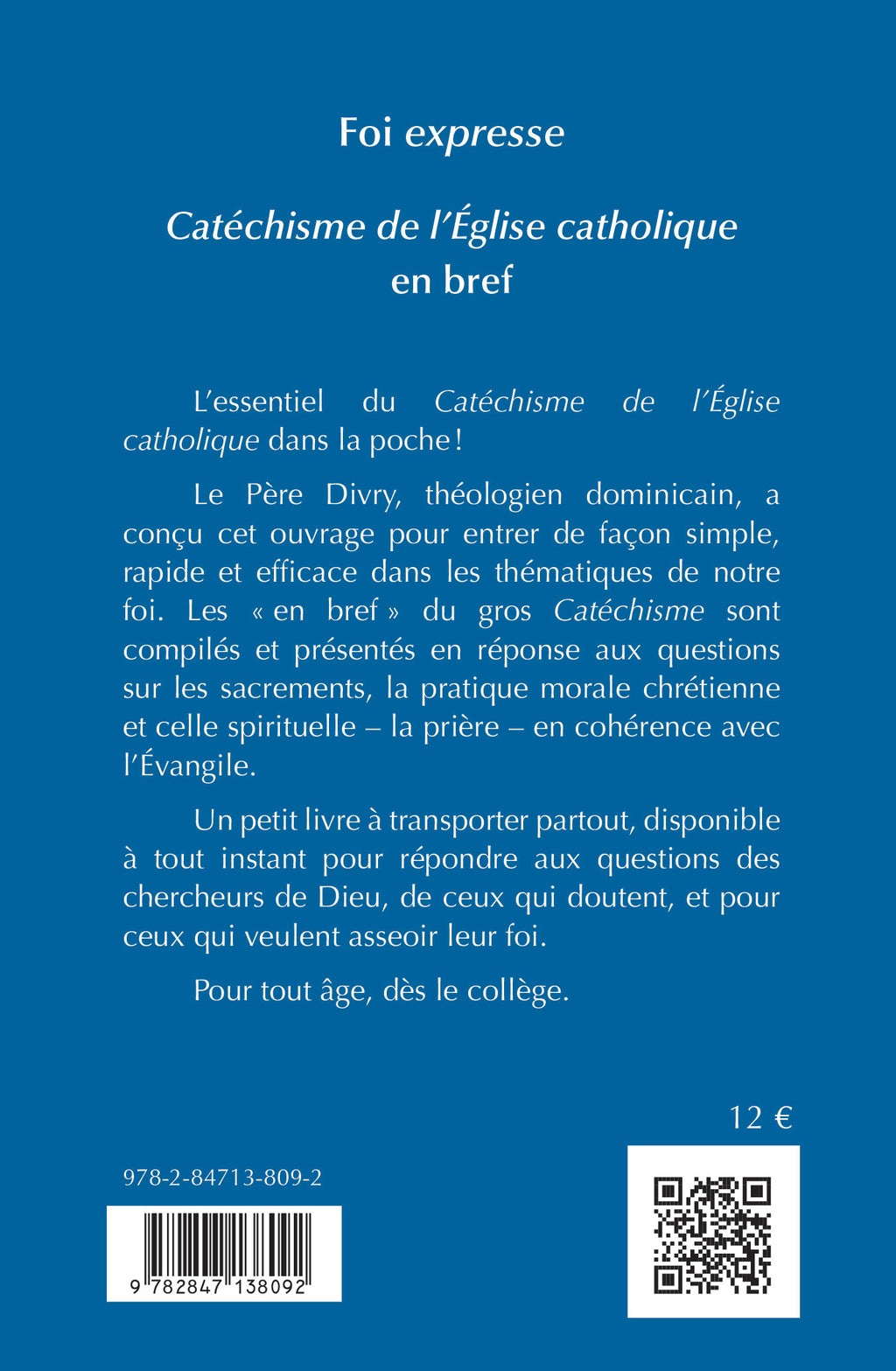 Le lecteur y trouvera la compilation des en-bref du Catéchisme de l'Église catholique, chacun précédé d'une question cruciale. Ce jeu de questions/réponses offre ainsi une profession de foi détaillée, la plus accessible possible, efficace, maintes fois vérifiée par l'auteur (jeunes de collège, adultes en préparation des sacrements, prison)', ce qu'il faut savoir en gros sur les sacrements, et aussi sur la pratique morale chrétienne et celle spirituelle (prière) en cohérence avec les Évangiles.