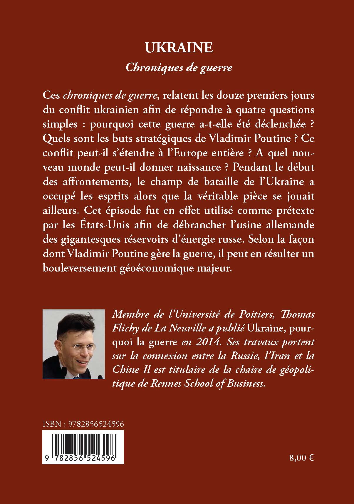 Ces chroniques de guerre, relatent les douze premiers jours du conflit ukrainien afin de répondre à quatre questions simples : pourquoi cette guerre a-t-elle été déclenchée ' Quels sont les buts stratégiques de Vladimir Poutine ' Ce conflit peut-il s'étendre à l'Europe entière ' A quel nouveau monde peut-il donner naissance ' Pendant le début des affrontements, le champ de bataille de l'Ukraine a occupé les esprits alors que la véritable pièce se jouait ailleurs. Cet épisode fut en effet utilisé comme prétexte par les États-Unis afin de débrancher l'usine allemande des gigantesques réservoirs d'énergie russe. Selon la façon dont Vladimir Poutine gère la guerre, il peut en résulter un bouleversement géoéconomique majeur. AUTEUR Membre de l'Université Paris IV - Sorbonne, Thomas Flichy de La Neuville est agrégé d'histoire et docteur en droit. Ses travaux portent sur la capacité des civilisations à transmettre la vie sur la longue durée. Professeur à l'École Spéciale Militaire de Saint-Cyr, il intervient dans de nombreuses universités étrangères, notamment à l'United States Naval Academy, la Higher School of Economics et l'Université d'Oxford.