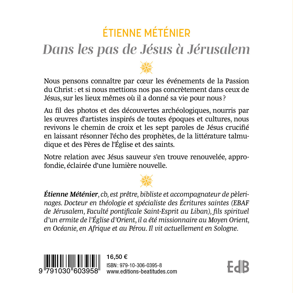 Nous pensons connaître par c'ur les événements de la Passion du Christ : et si nous mettions nos pas concrètement dans ceux de Jésus, sur les lieux mêmes où il a donné sa vie pour nous ' Au fil des photos et des découvertes archéologiques, nourris par les 'uvres d'artistes inspirés de toutes époques et cultures, nous revivons le chemin de croix et les sept paroles de Jésus crucifié en laissant résonner l'écho des prophètes, de la littérature talmudique et des Pères de l'Église et des saints. Notre relation avec Jésus sauveur s'en trouve renouvelée, approfondie, éclairée d'une lumière nouvelle.